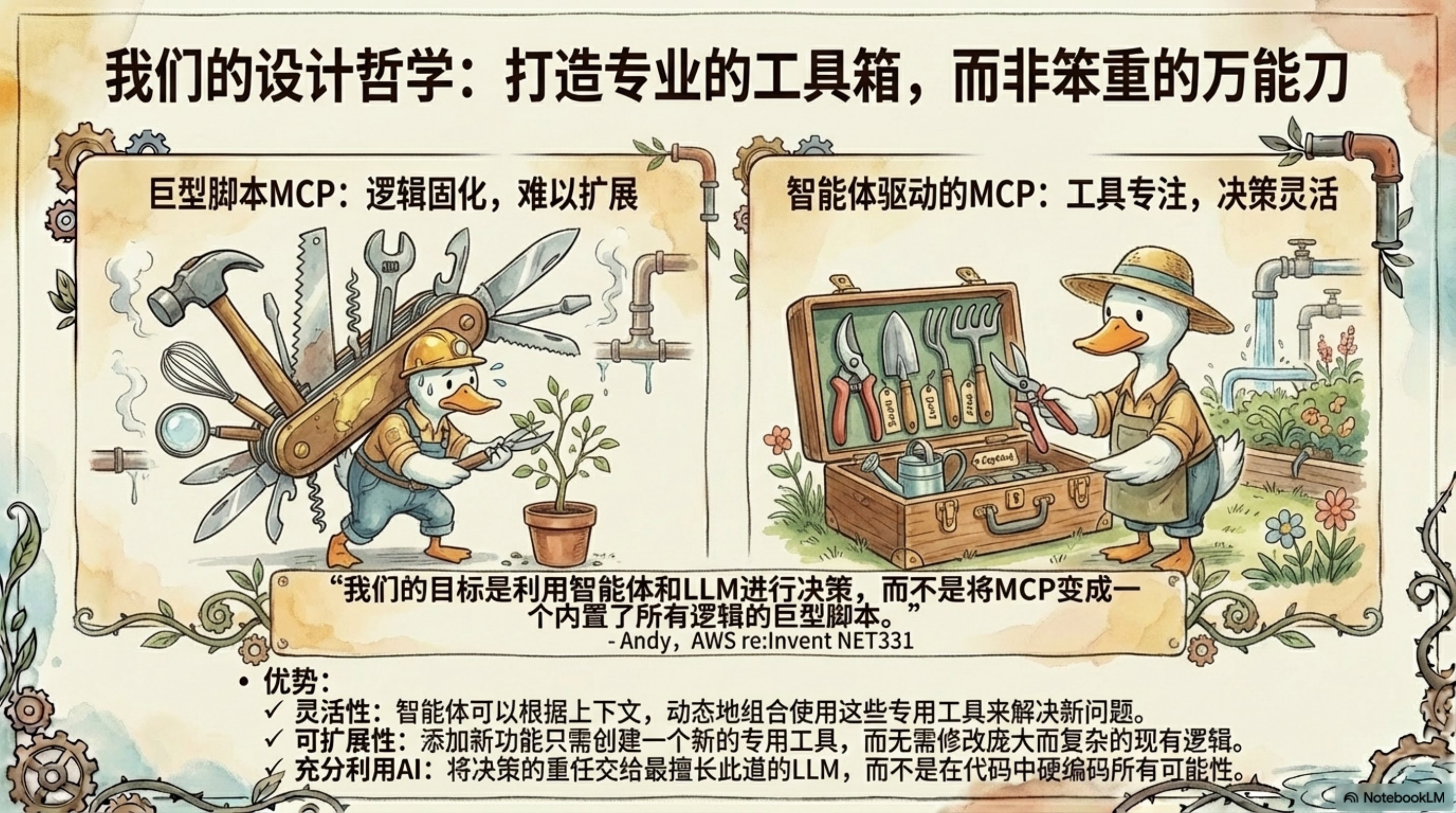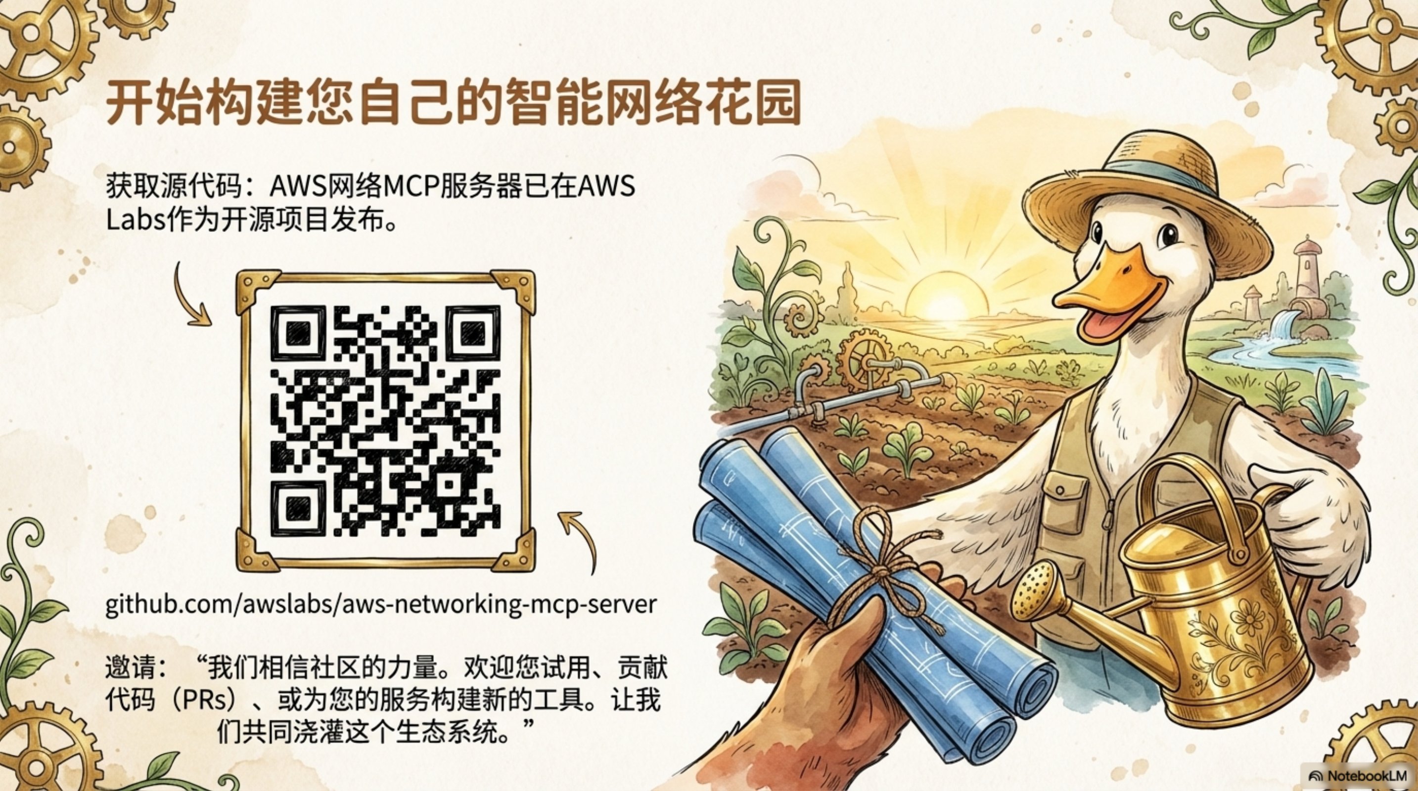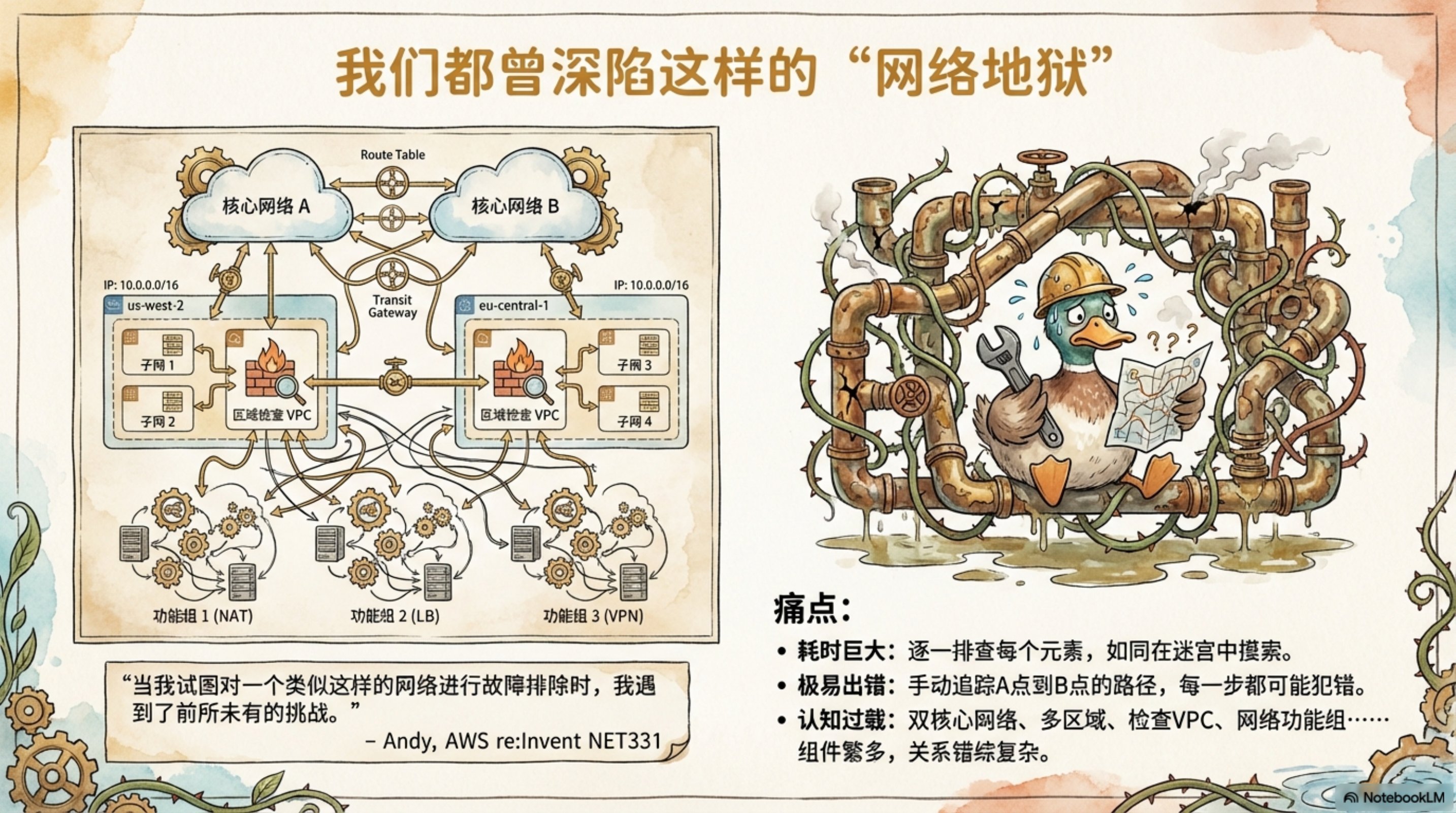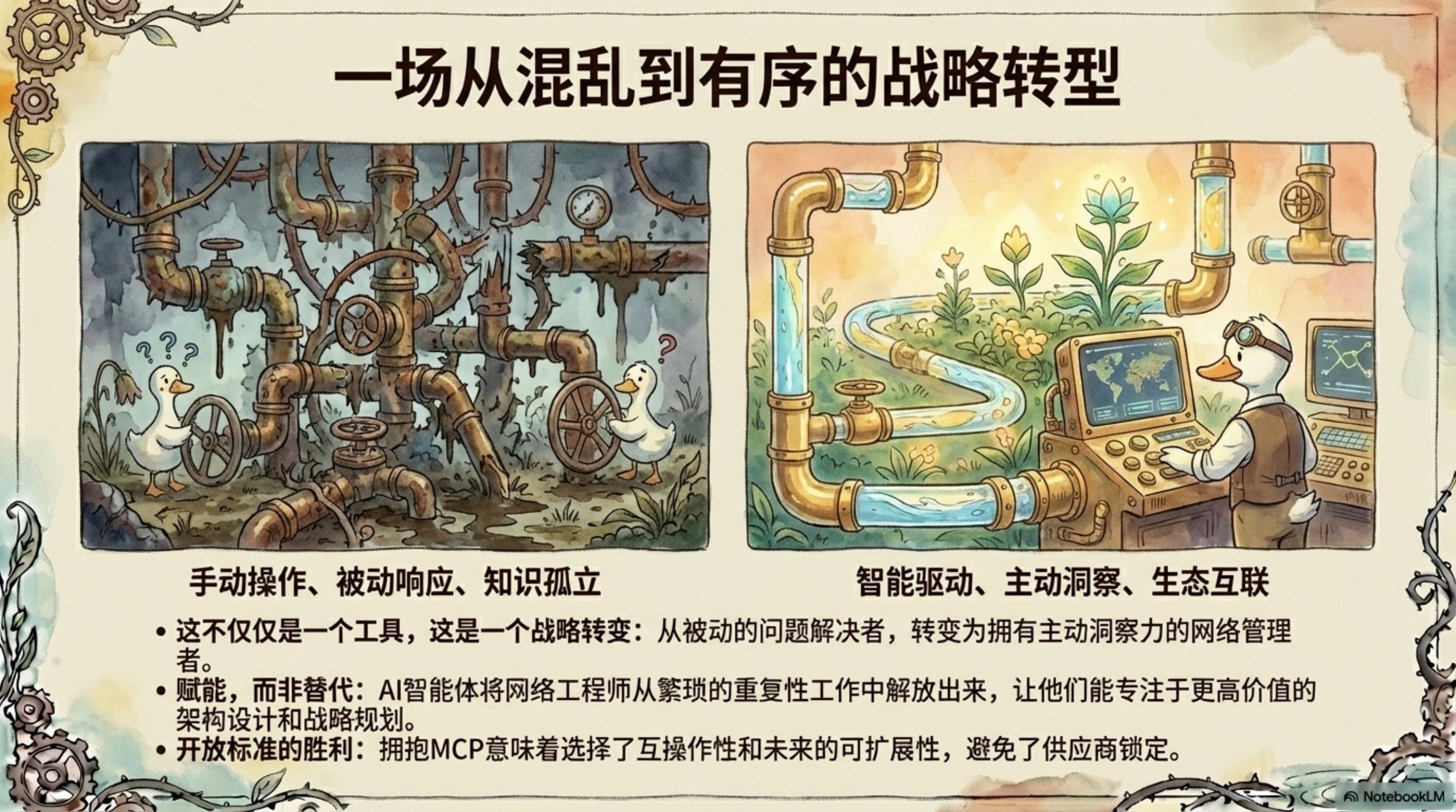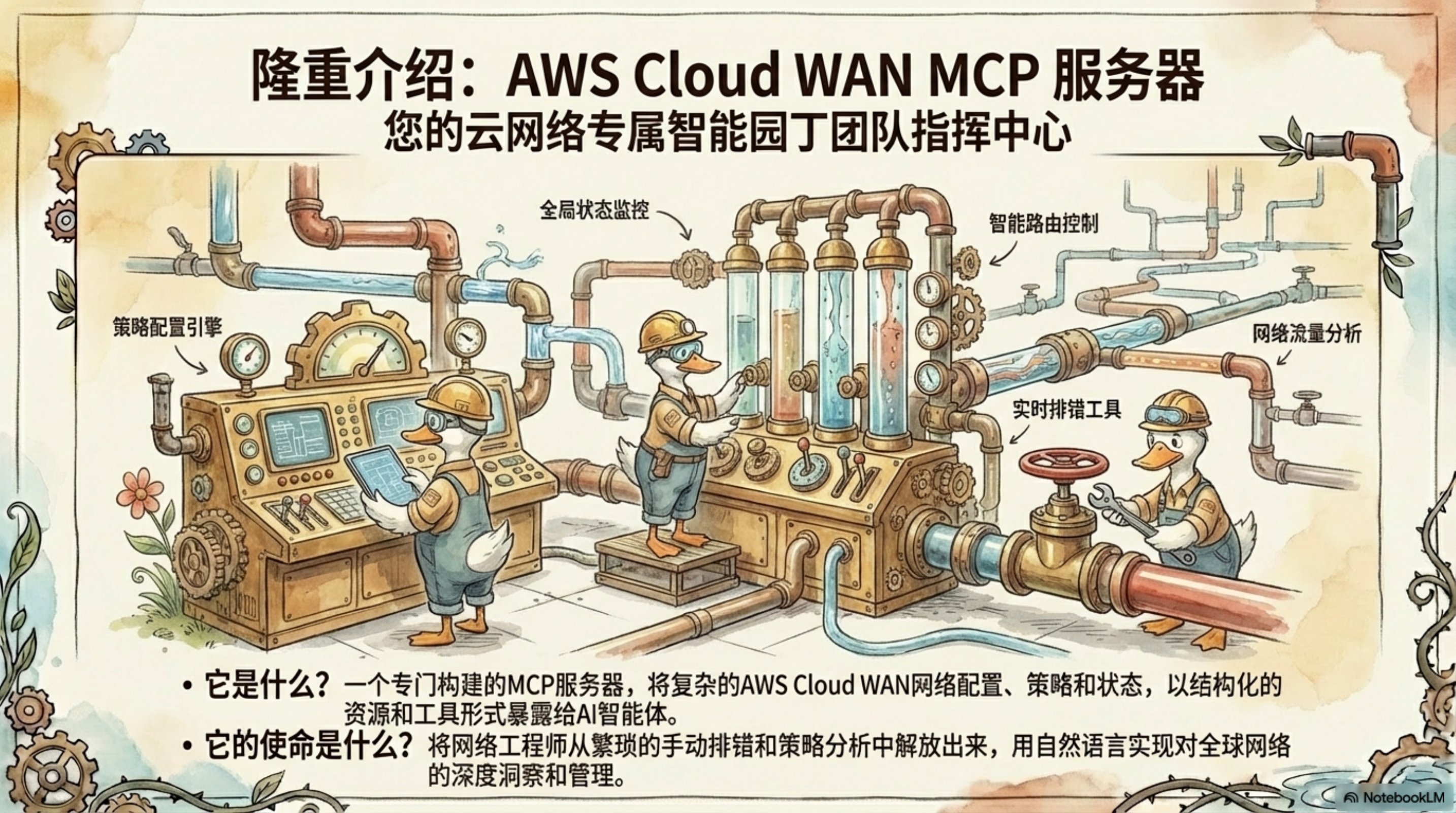 这份演示文稿由 NotebookLM 生成,深入探讨了如何利用 AI Agent 和 MCP(Model Context Protocol)服务器来革新云网络运营。通过生动的插图和清晰的架构图,展示了 AWS Cloud WAN MCP 服务器的设计理念和实际应用。
