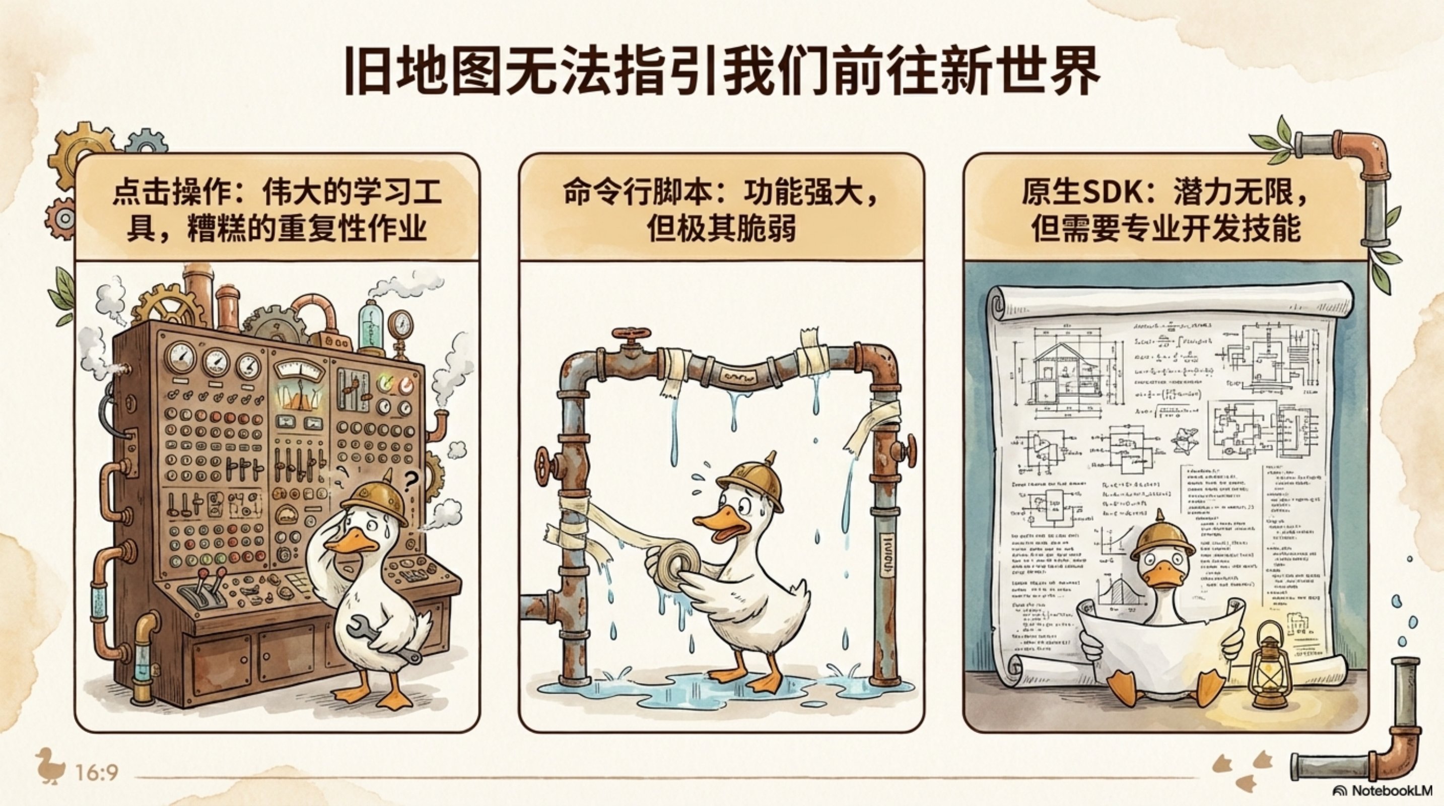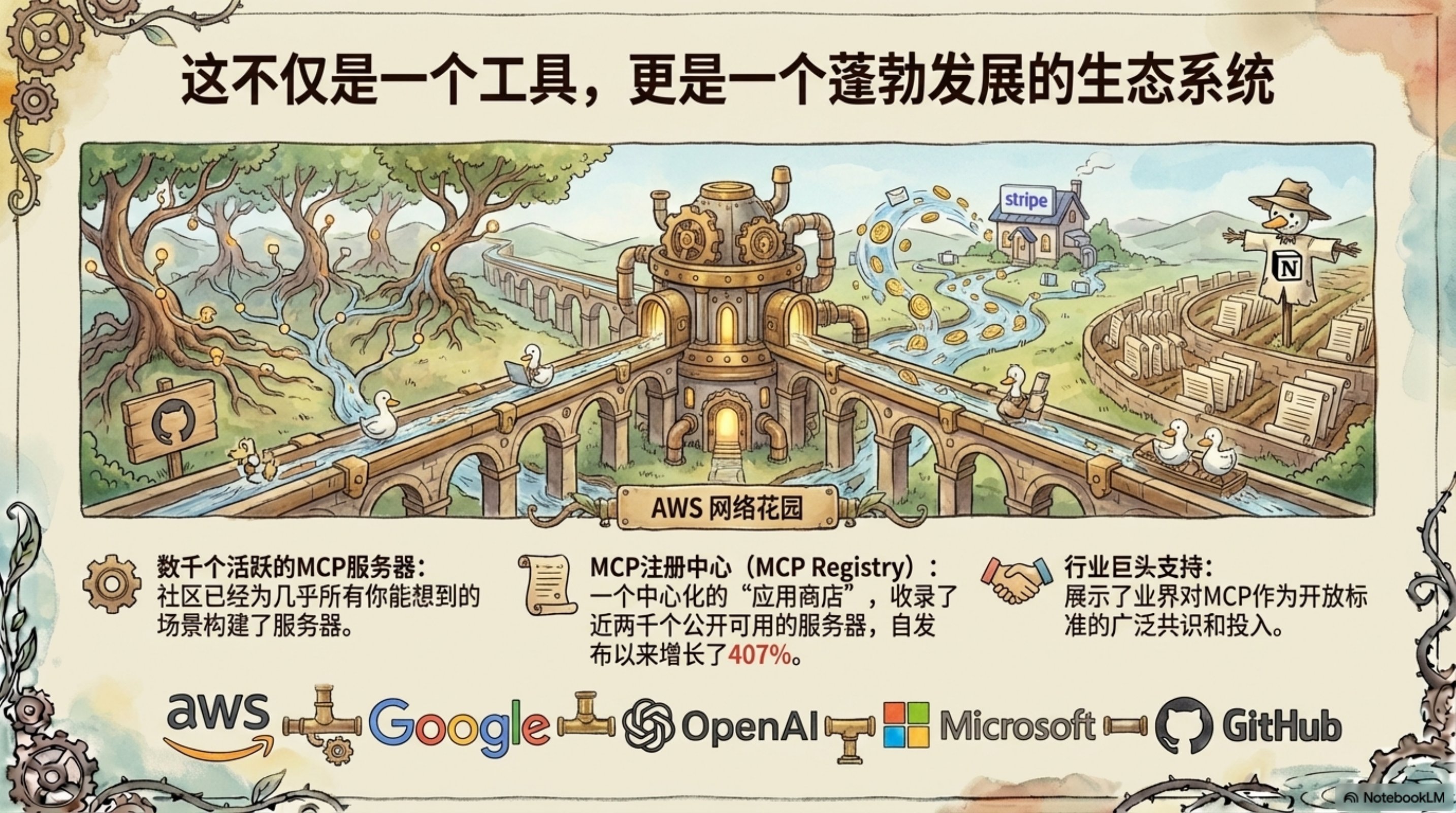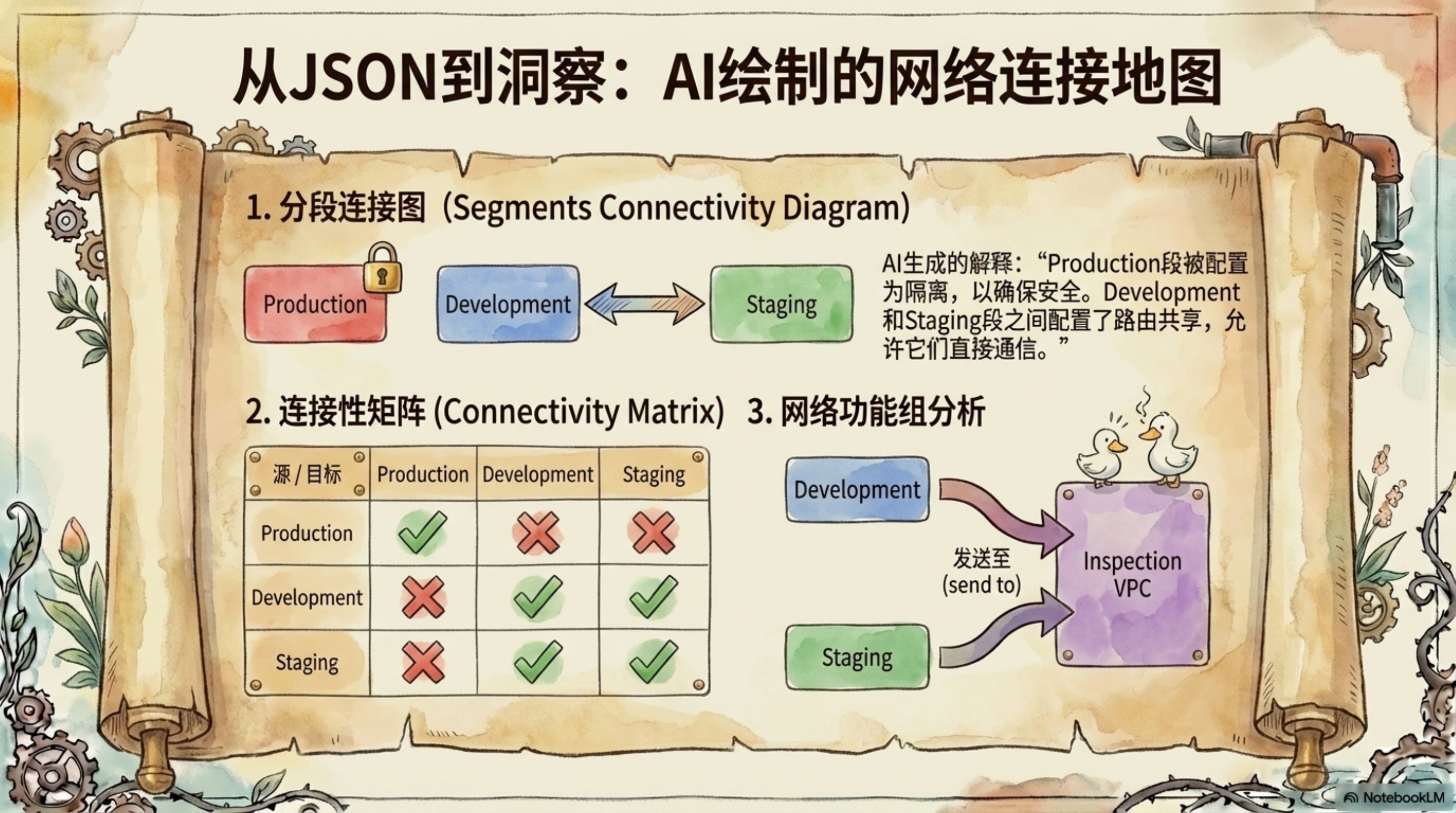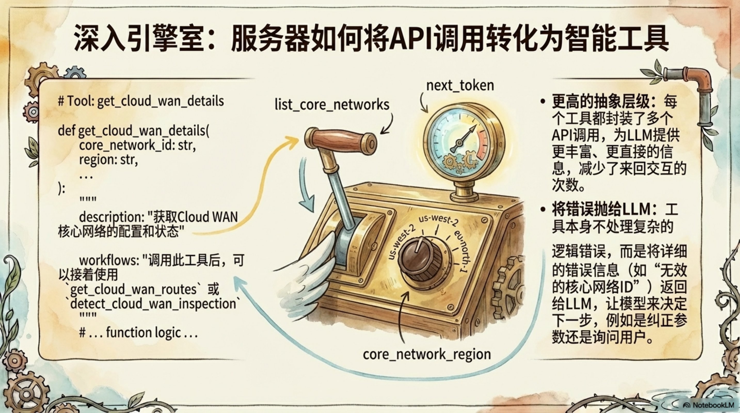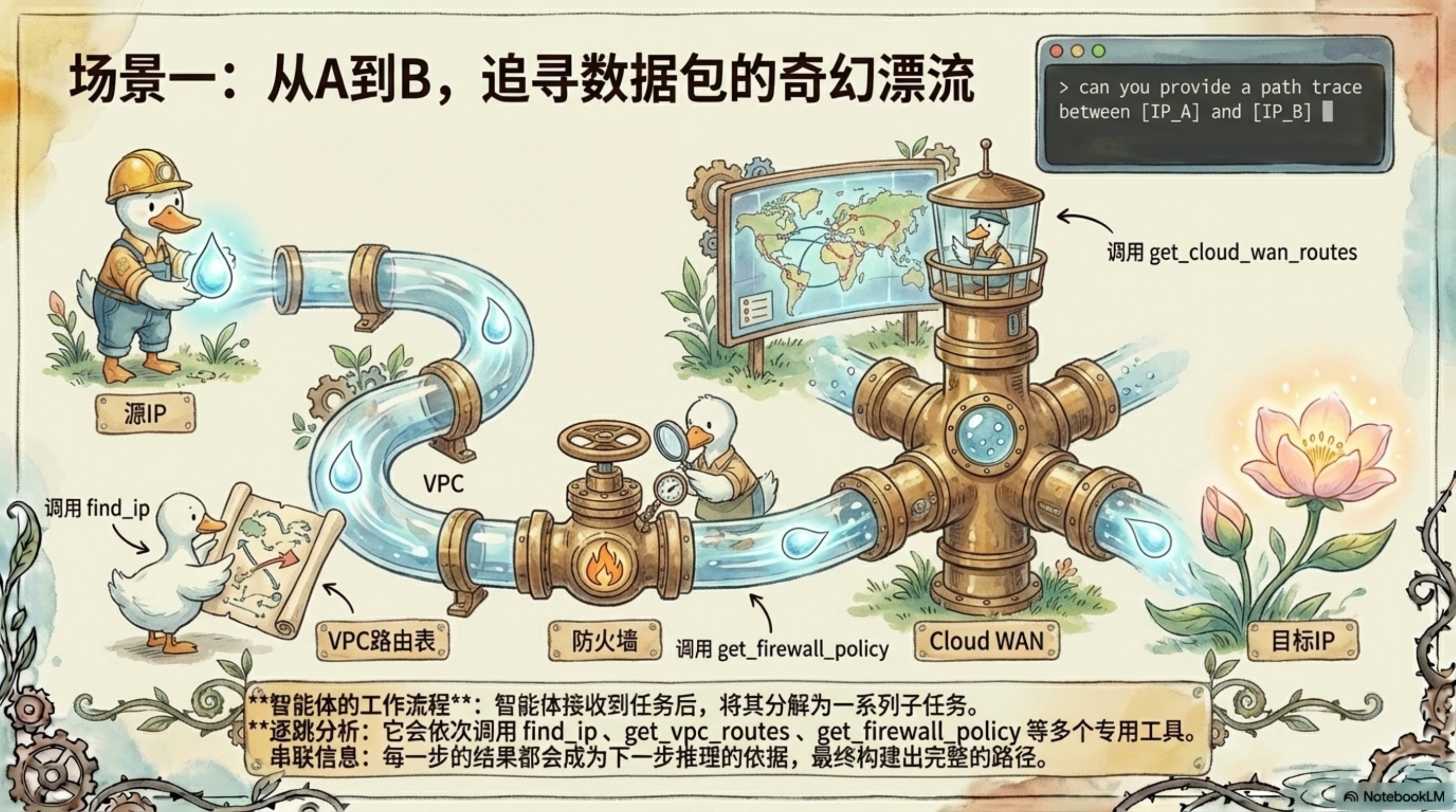 这份演示文稿由 NotebookLM 生成,深入探讨了如何利用 AI Agent 和 MCP(Model Context Protocol)服务器来革新云网络运营。通过生动的插图和清晰的架构图,展示了 AWS Cloud WAN MCP 服务器的设计理念和实际应用。